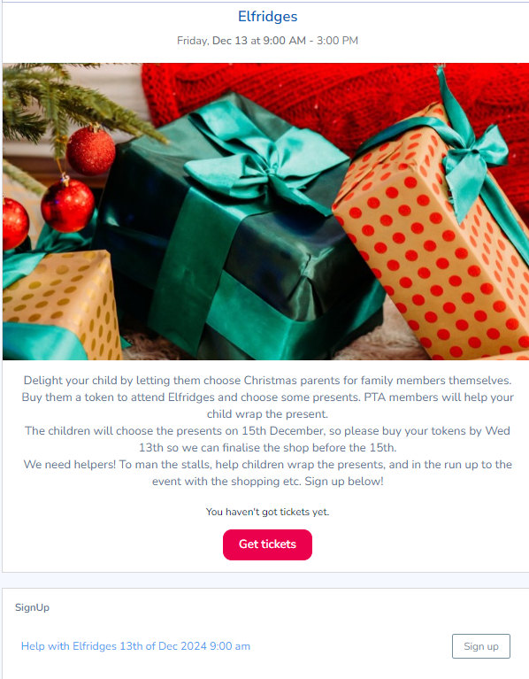 When you receive an invitation to a paid event, you can buy tickets through Classlist using Stripe card payments without leaving the app. Where you would normally click the red 'Reply' button to RSVP to a free event, for a ticketed event simply click on the 'Get tickets' button.
