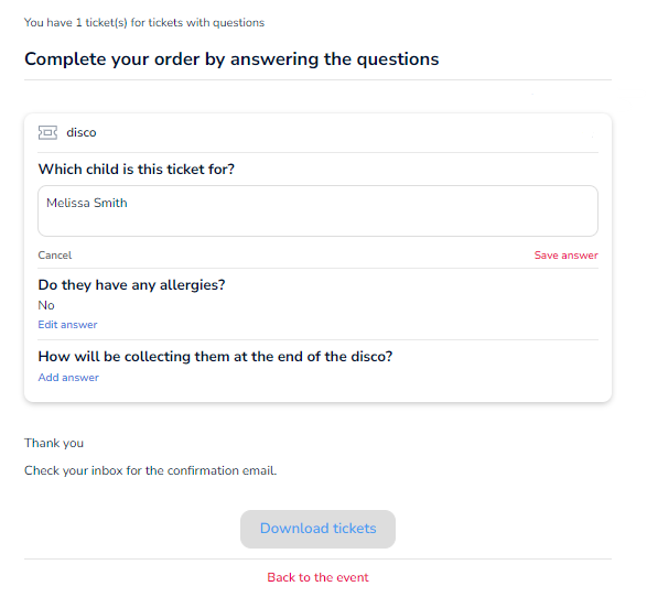 Your event creator may have asked a question such as "Which food choice do you want?" or "Do you have any allergies?". For every ticket you have bought you need to add answers to these questions and click 'save answer'. Provided you have bought tickets via your account rather than through the public checkout your answers can be edited by you in the run up to the event.