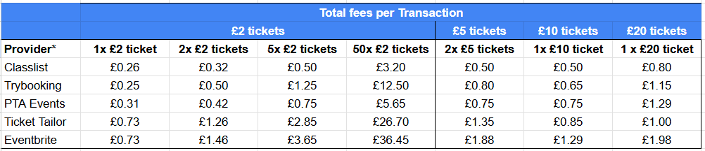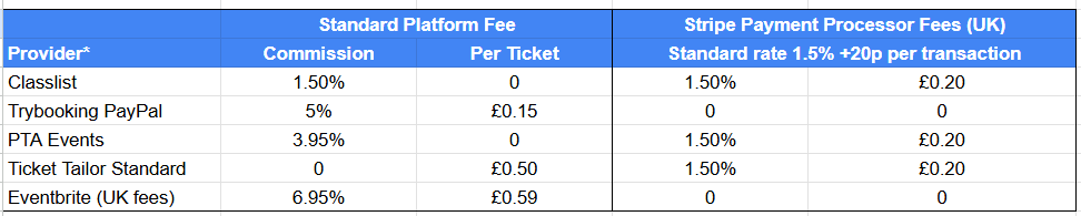 A major benefit for schools and PTAs is that we are the cheapest event ticketing platform out there. The tables below compare Classlist to our competitors to demonstrate this.