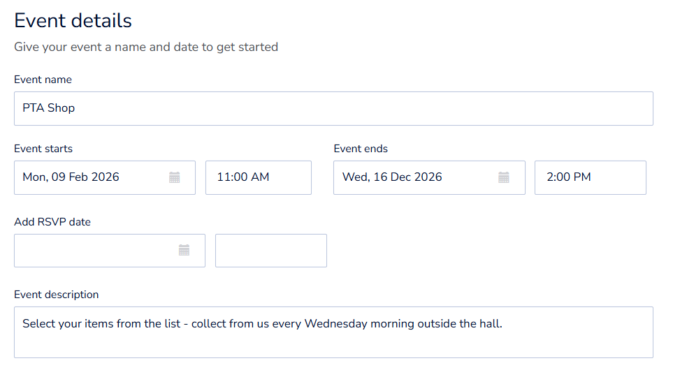 NB: Don't set an RSVP date for a shop as people won't be able to make purchases after an RSVP date has passed. RSVP dates are useful for events where you want to stop selling tickets and finalise your numbers before the event as sales stop on that date.